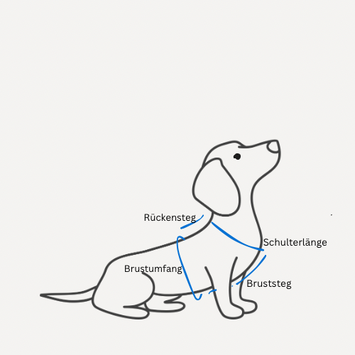 Damit dein Mrs.Trahlala-Geschirr perfekt sitzt, benötigen wir vier Maße. Bitte miss deinen Hund im Stehen und möglichst entspannt.